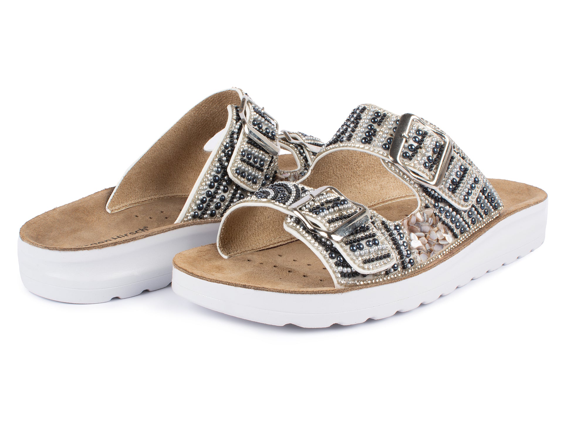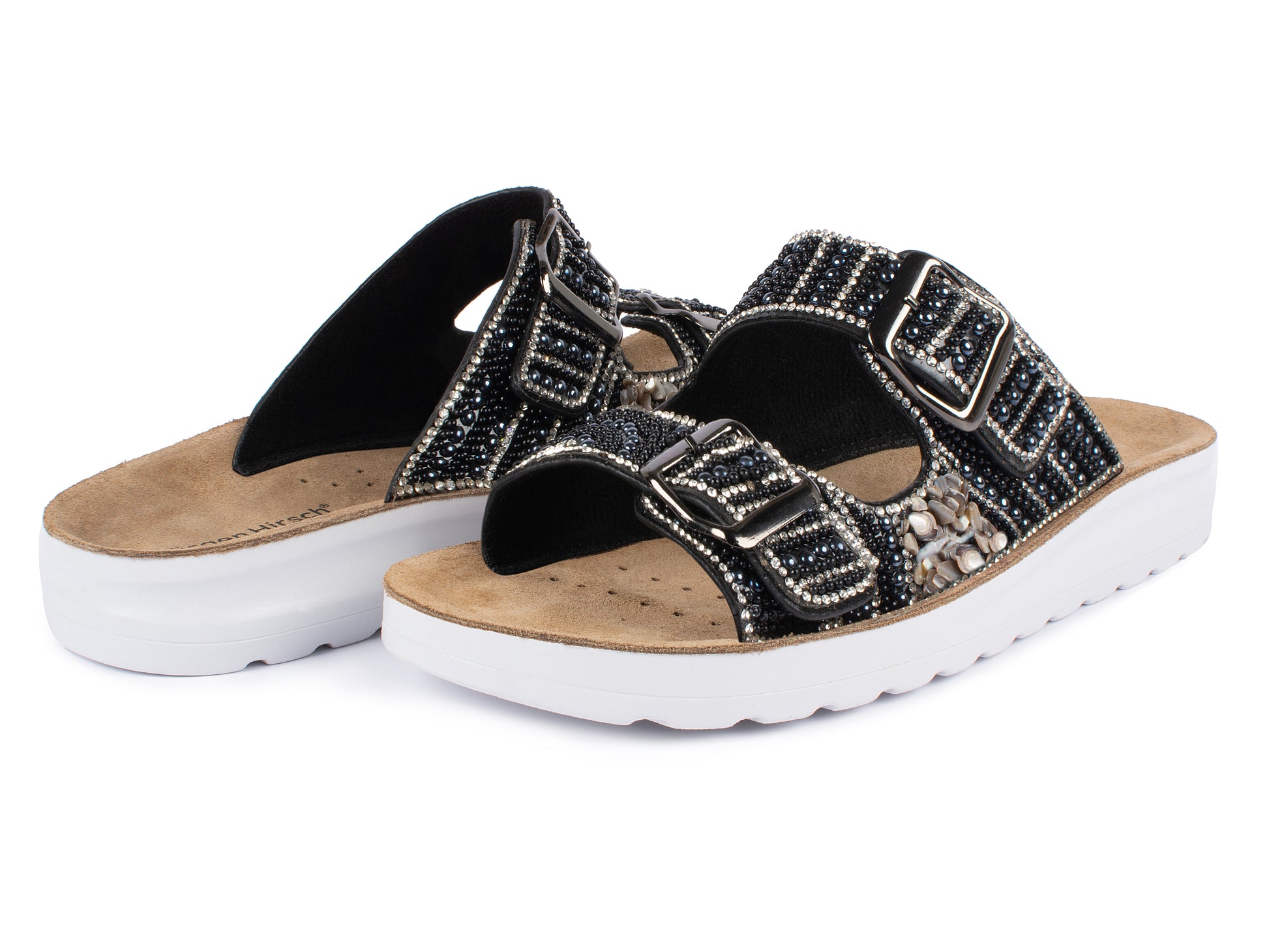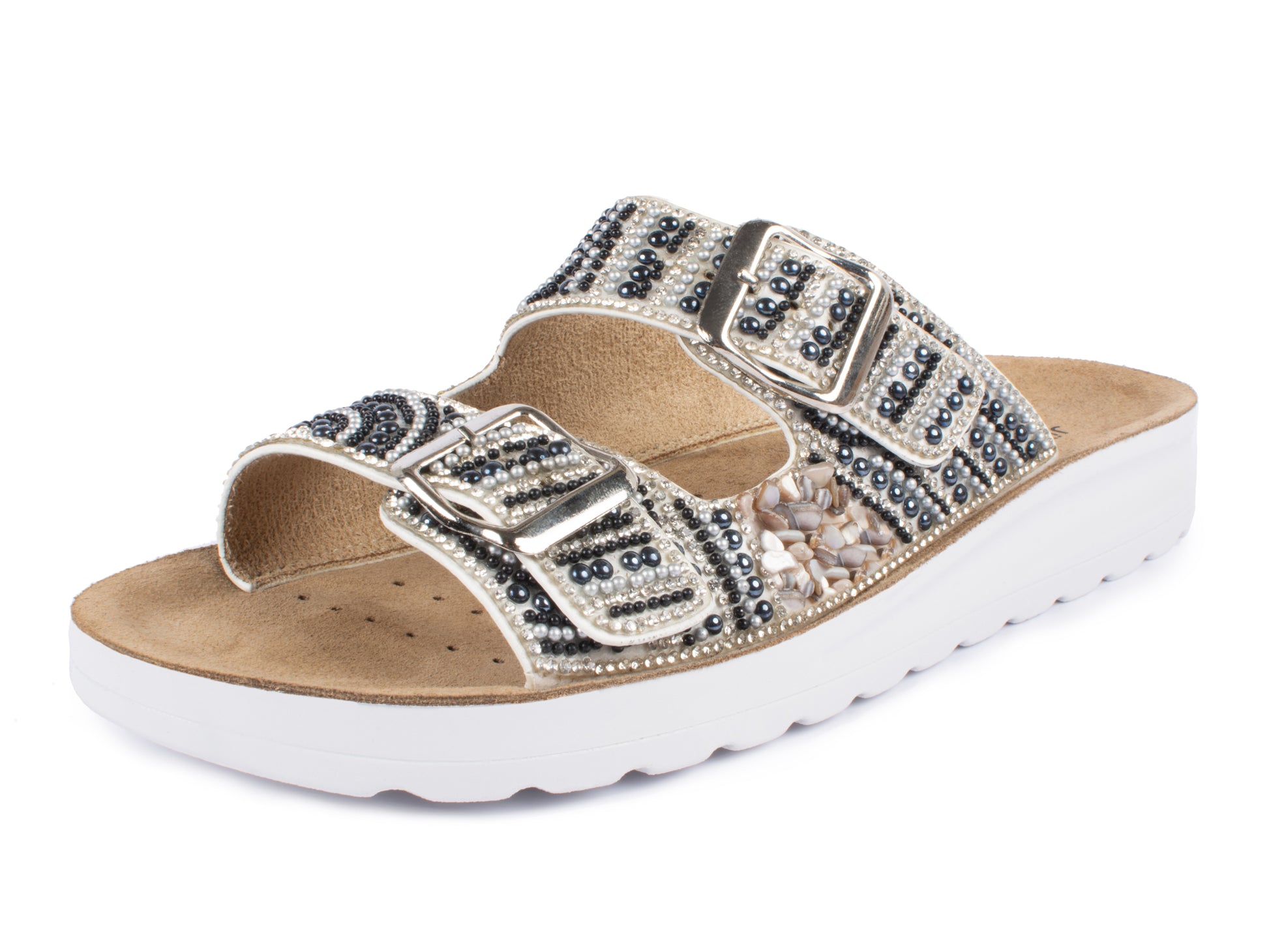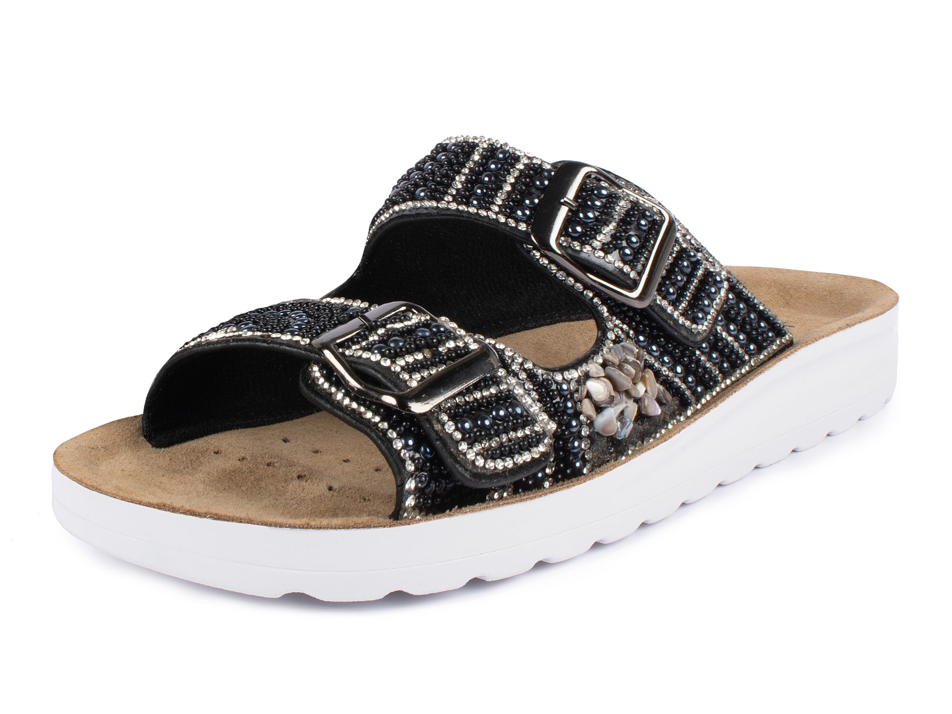 Dank der zwei verstellbaren Schließen lässt sich die Pantolette flexibel an den Fuß anpassen. In der Bequemweite G eignet sie sich ideal für normal breite Füße mit höherem Komfortanspruch. Die rutschhemmende, abriebfeste Laufsohle bietet Stabilität auf glatten Böden – drinnen wie draußen.