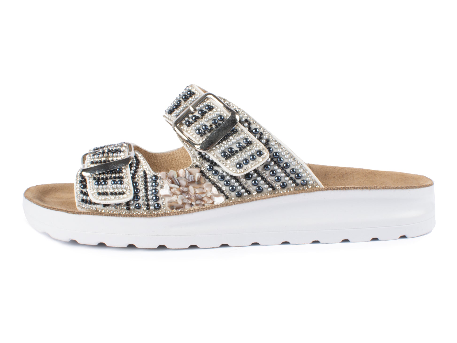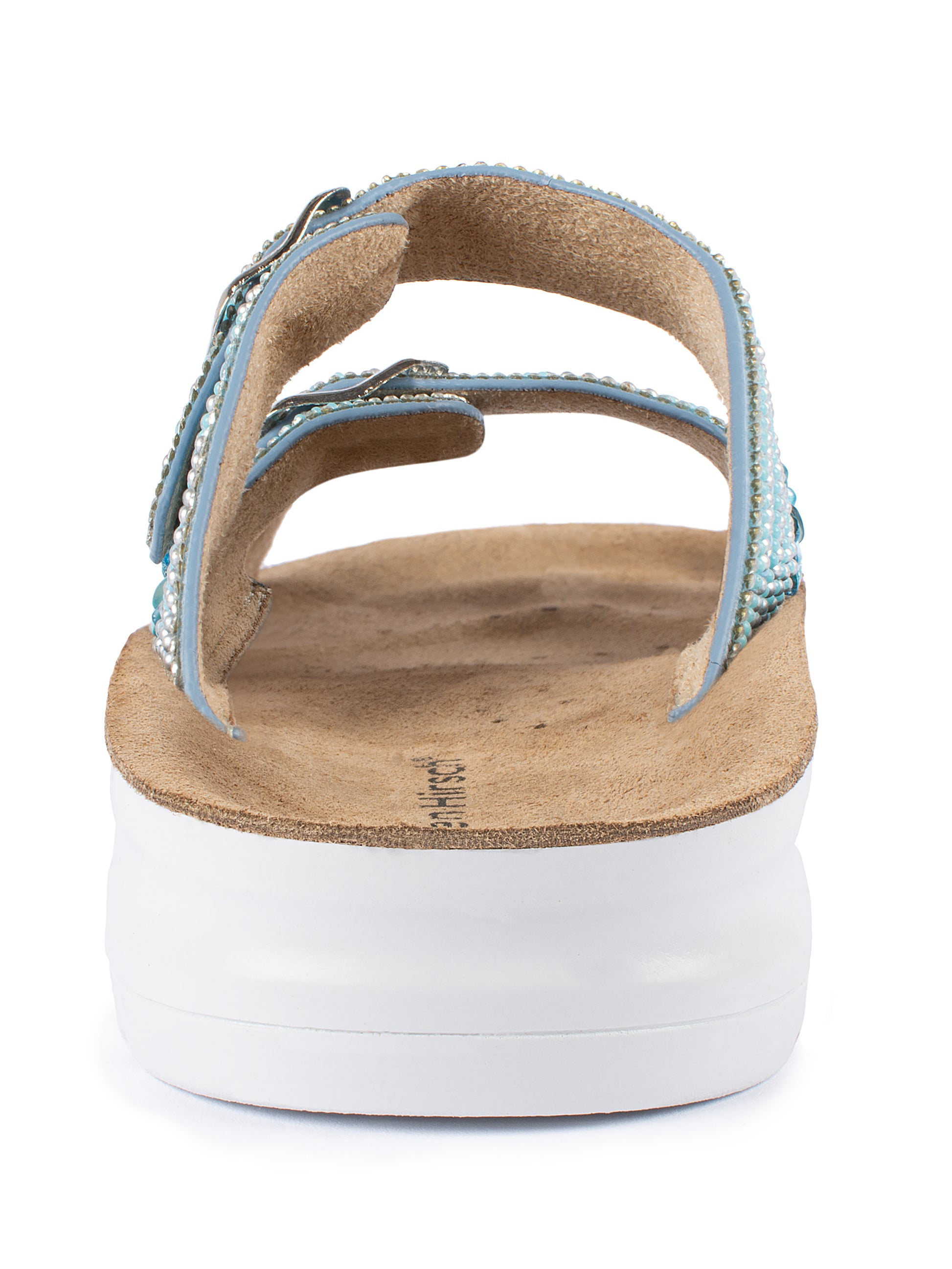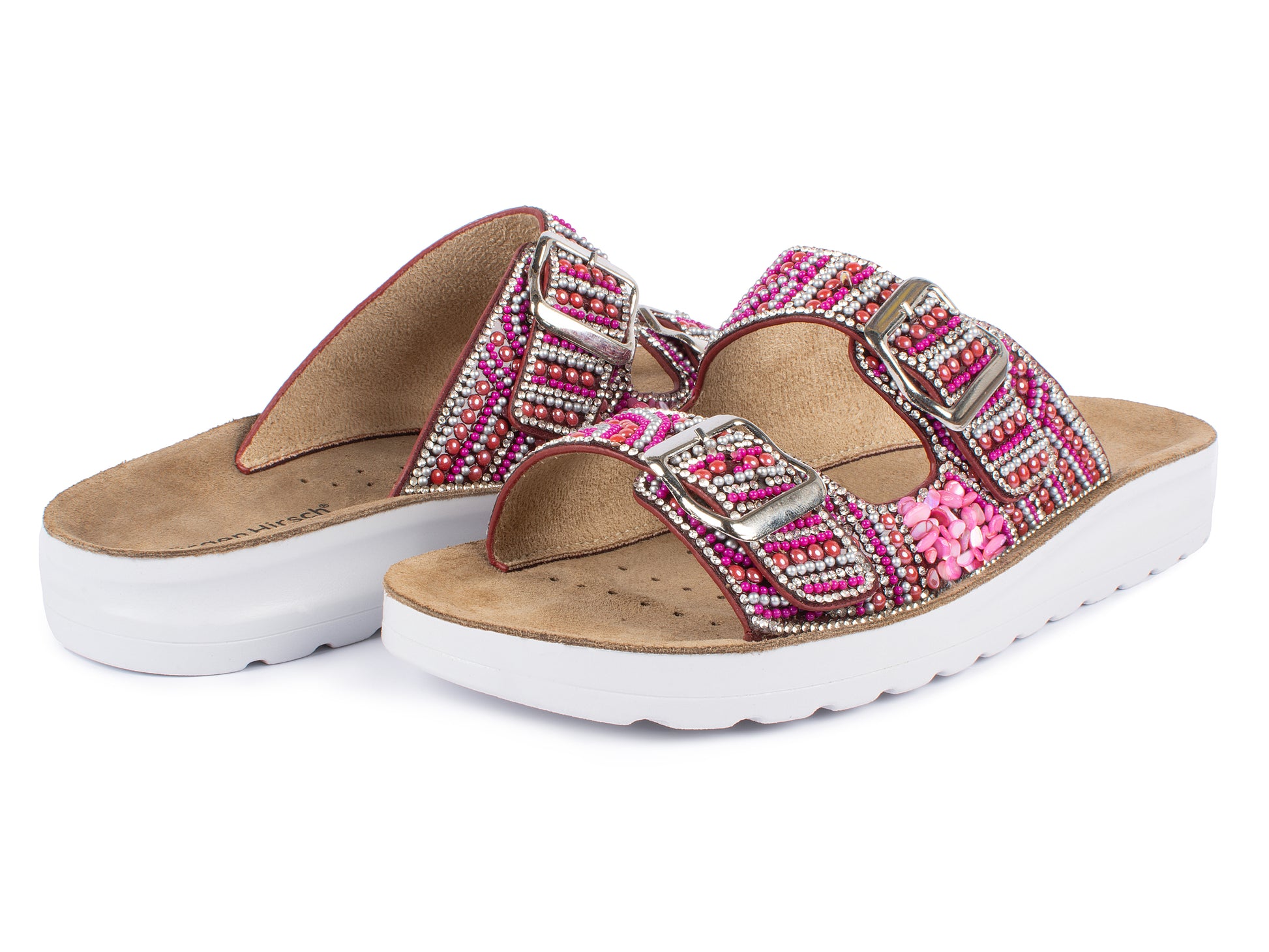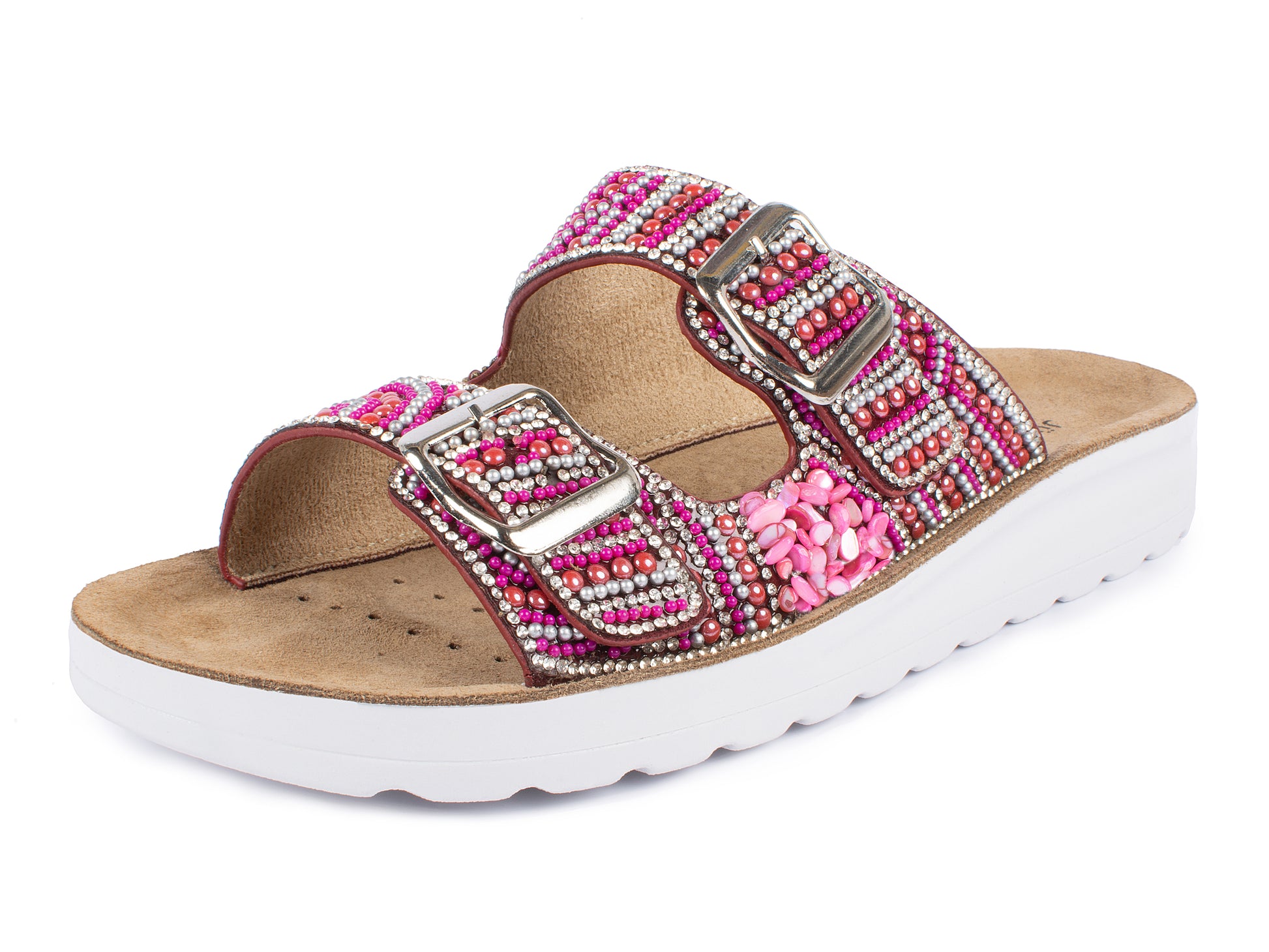 Dank der zwei verstellbaren Schließen lässt sich die Pantolette flexibel an den Fuß anpassen. In der Bequemweite G eignet sie sich ideal für normal breite Füße mit höherem Komfortanspruch. Die rutschhemmende, abriebfeste Laufsohle bietet Stabilität auf glatten Böden – drinnen wie draußen.